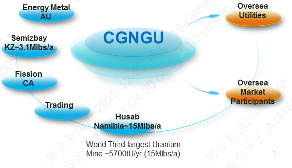 中廣核國際鈾產品銷售公司 (CGNGU) 2014年7月成立于英國,2019年1月并入中廣核集團旗下海外鈾資源開發的投、融資的唯一平臺中廣核礦業有限公司,亦是其唯一海外貿易平臺。